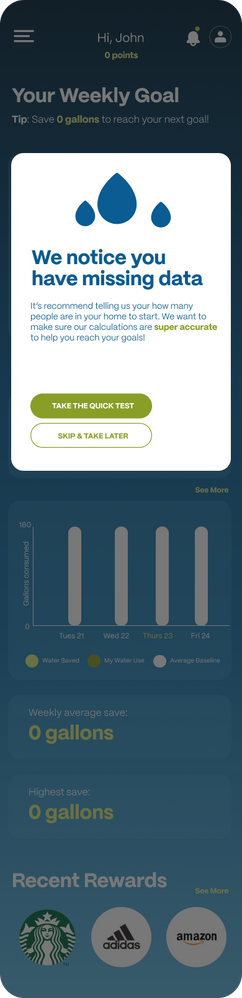 MAIN HOME PAGE: displays weekly goal, points, water data and water saved throughout the week, user's recently viewed rewards